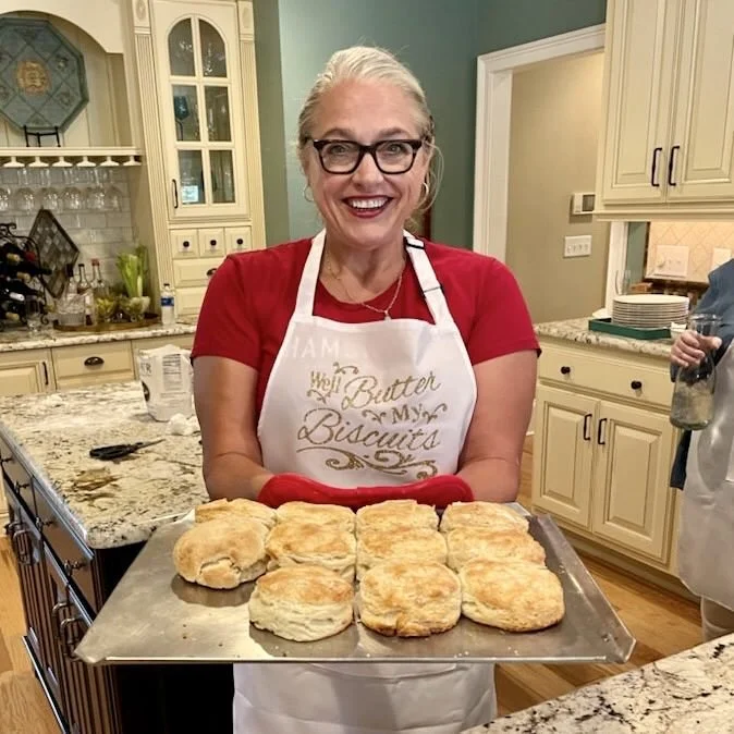 The story shifts to private chef Lauren Furey, host of Now We’re Cookin’ on SCETV. Lauren learned biscuit-making from her late mentor and dear friend, Nathalie Dupree, who taught her the value of using a food processor for light mixing—a small but effective technique that helps prevent overworking the dough. Lauren’s signature twist is the addition of a little cornmeal for texture and a touch of sugar for sweetness. “Sugar and cornmeal are one happy combination,” she says.